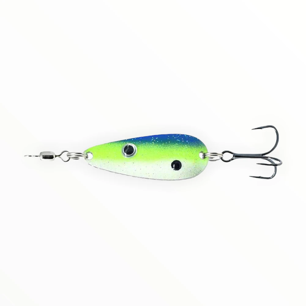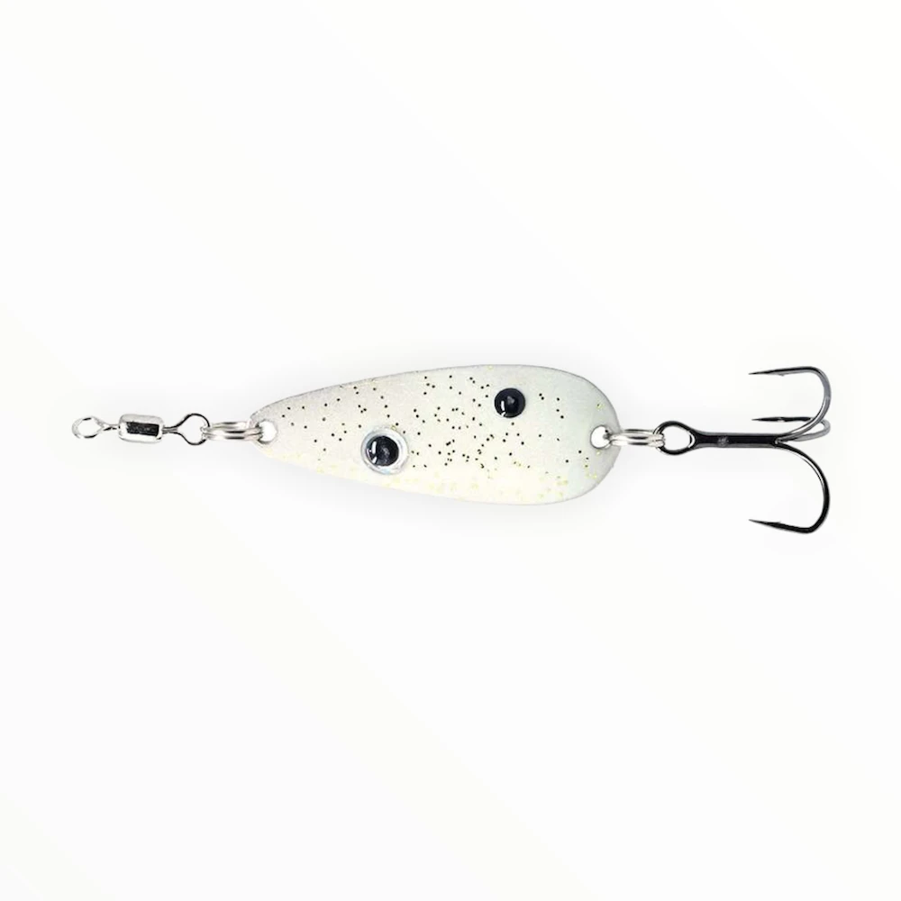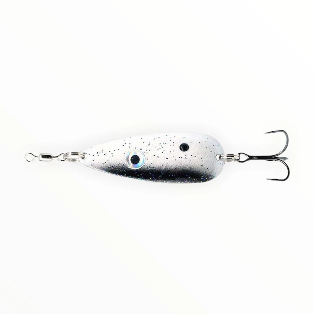 The Rat-a-Tat Flutter Spoon is a double flutter spoon that is different than others you have seen. This design has been a closely guarded secret by spoon fisherman in the know but now is available to you. The two blanks cause all kinds of noise in the water and it can be cast a mile without worrying about the wind catching it like larger spoons. We loaded them with Gamakatsu EWG hooks to make sure the fish don’t stand a chance if they get near it and put a 130 lb swivel on it to eliminate line twist. Fully powder-coated and cleared, they have been called indestructible by the guys who have tried them and are 100% made in the USA.