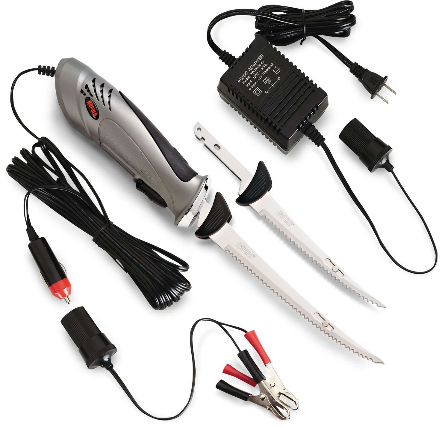 The Deluxe Electric Fillet Knife Set works wherever you are. Powerful and quiet motor, with advanced air flow design, makes fast and effortless work of any filleting chore. Includes all adapters for plugging into any wall outlet, connecting to trolling motor battery posts or plugging into car or boat lighter outlet for full filleting power. Set includes both 6” and 7-1/2” reciprocating blades, the right sizes to match your filleting job. Everything fits neatly into convenient travel case. With this complete kit, it’s like a shortcut to the frying pan. Case: Blow Molded Plastic. Blades: Stainless Steel.